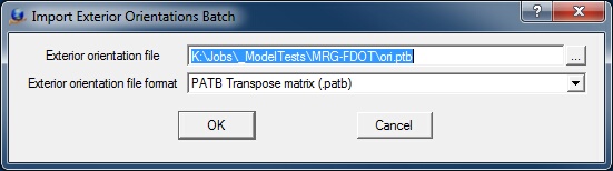 Exterior Orientation File Defines the file that contains the exterior orientation parameters. This file normally contains the parameters for multiple images, be they an entire job or a single aerial triangulation bundle adjustment. Please refer to the document Importing Orientations for more information. Exterior Orientation File Format Specifies the format of the file defined above in "Exterior orientation file".