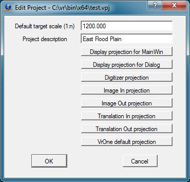 The Edit Project dialog box Default target scale Defines the default target scale to assign new VrOne/VrTwo vector files. This value is expressed as a ratio. For example, 1:1200 would be equal to 1"=100'. Project description A project description for informational purposes may be entered in this field. Display projection for MainWin The right side of the VrOne/VrTwo Main Window displays the current cursor location. This defines the coordinate projection for this coordinate display. If this projection is turned off then coordinates will be displayed in the same coordinate projection as the VrOne/VrTwo file. Display projection for Dialog An additional coordinate display may be shown by using the Coordinate Dialog Box (CooDia) command. This defines the coordinate projection for this display. If this projection is turned off, coordinates will be displayed in the same projection as the VrOne/VrTwo file. Digitizer projection Defines the coordinate projection for input systems such as the VrTwo model orientation, analog and analytical stereo plotters, Xy digitizers, ADS40, and SOCET SET. If this projection is turned off, the coordinates will be sent without transformation to VrOne/VrTwo in the projection of the input device. Image in projection Defines the coordinate projection for images that are used as input. VrOne has the ability to display images such as orthophotos and images such as these are geo-referenced and have a defined coordinate projection. If this projection is turned off the coordinates will be sent to VrOne/VrTwo in the coordinate projection of the image, without transformation. Image out projection Defines the coordinate projection for images that are created by Vr Mapping. For example, VrOrtho can set the coordinate projection for the geo-referencing of the output image. If this projection is turned off the coordinates of the image will be in the same coordinate projection of the system that created them. For example, when generating orthophotos, if the coordinate projection is turned off then the coordinate projection will be in the same as the single photo resection coordinate projection. Translation In projection The coordinate projection of the input files for such translators such as Dxf and Microstation may be defined with this coordinate projection. If this projection is turned off the coordinates will be sent to VrOne/VrTwo in the projection of the input file, without transformation. Translation Out projection The coordinate projection of the output files for such translators such as Dxf and Microstation may be defined with this coordinate projection. If this projection is turned off the coordinates of the output file will be the same coordinate projection as the VrOne/VrTwo file. VrOne default projection Each VrOne/VrTwo files coordinate system may be defined in any of the supported coordinate projections. If this projection is turned on then any new VrOne/VrTwo vector files will be set to this coordinate projection. If this coordinate projection is turned off then the VrOne/VrTwo coordinate projection will be undefined. The coordinate projection for a VrOne/VrTwo file may be set at any time after file creation with the Edit Vr Header (EdiVr) command. Defining a Coordinate Projection Some or all of the eight possible coordinate projections may be defined.