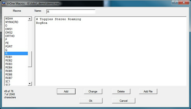 There are more parameters that would need to be set to make the spot elevation functions keys work as expected but the above example shows how to chain function keys together. On quit cmd The on quit command will be executed when the function key application ends. This field may consist of key-ins, macros or other function keys. On quit commands are commonly used to set global parameters to a know state when an application ends. For example, if a function key was snapping to existing entities to obtain elevations, the on quit command may be used to turn snapping off. “Become proficient in another language – or at least get the tapes and try.” - Richard A. Moran Macros give the ability to execute a group of VrOne commands as a single word. Macros can execute VrOne commands, function keys and other macros. It is common to use macros to condition snap parameters; they is useful for turning groups of layers on and off. In the following example, a macro called “R” toggles stereo roaming with the Toggle Roaming (TogRoa) command.