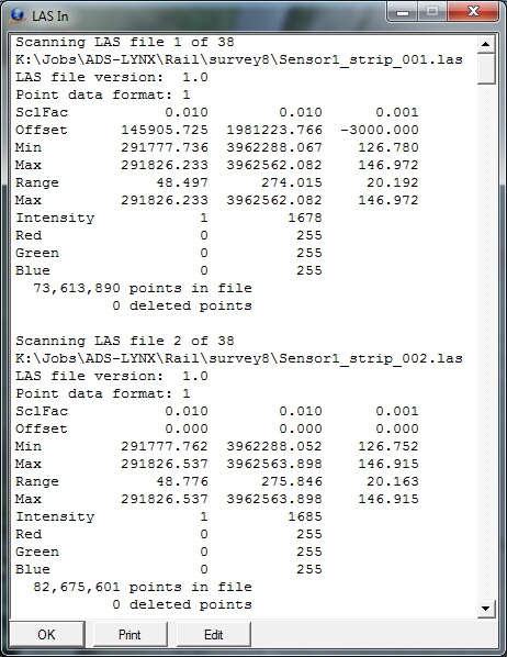 The Edit Parameters dialog Box Translate to separate VrOne files? Determines whether to translate each LAS input file to a separate VrOne file. The Input to Output filename cross-reference is set in the "Define Input Filenames" dialog. Target scale for new VrOne files (1:n) Defines target scale to use when creating the new VrOne file if the "Translate to separate VrOne files?" is on and a VrOne file does not exist during translation. Layer for points Specifies layer into which to place translated points. Translate deleted LAS points? One of the attributes stored with each LiDAR points is a delete flag, which allows points in the database to be marked as deleted. If this parameter is selected, deleted points are translated. Deleted points that are translated retain their delete flag in the Vr Mapping database. Maximum RGB value Defines the maximum RGB values that are expected in the LAS file. The Vr Point structure defines the RGB range as 0-255. If the Maximum RGB value is greater than 255, incoming RGB files are scaled to the range of 0-255. Delete target VrOne files before translation? If this option is checked each target VrOne file will be deleted before translation if it exists. If this option is unchecked and the target VrOne file exists, the new data will be appended to the file. This parameter is considered only if the "Translate to separate VrOne files" option is checked. Scans the currently defined LAS files and displays various information including coordinate, intensity and RGB ranges.